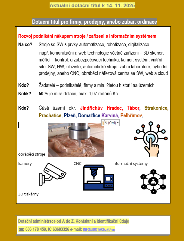 50% na nákup nových strojů a zařízení, podmínkou informační systém.