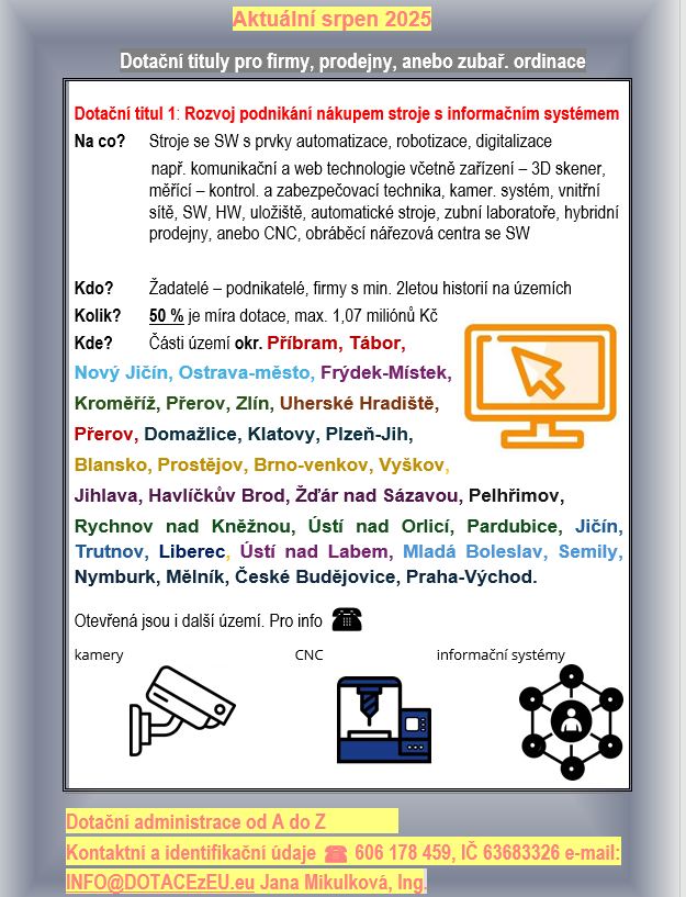 Podnikatelé a firmy DOTACE pro vás, nabídka srpen 2025
